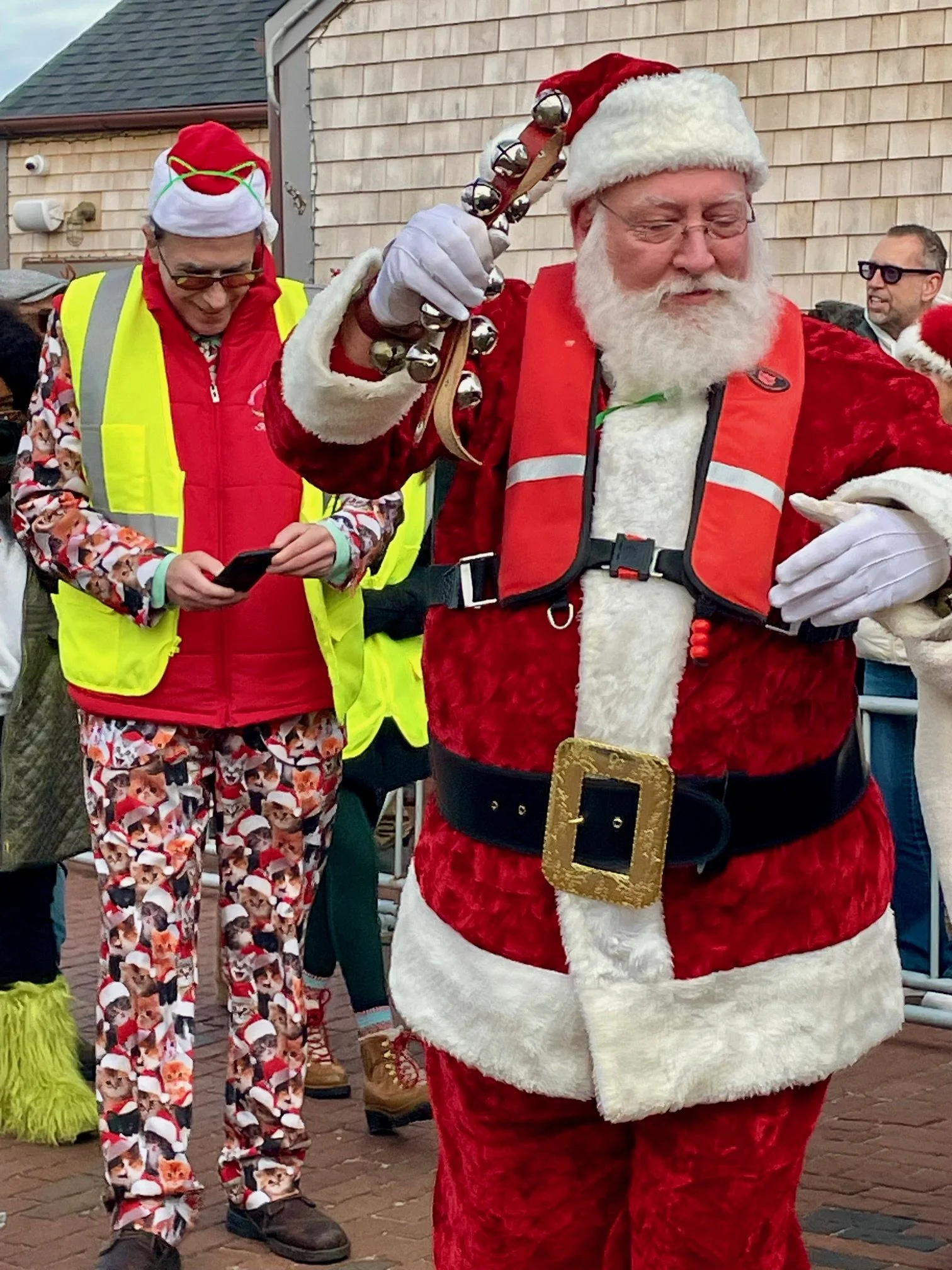 Before long, you can feel the streets start to get crowded. Everyone starts to gather to wait for this guy: the town crier. He rings his bell to announce it is time to walk down to the wharf to watch Santa come in on the Coast Guard boat, where he will board the firetruck and begin the parade through town!