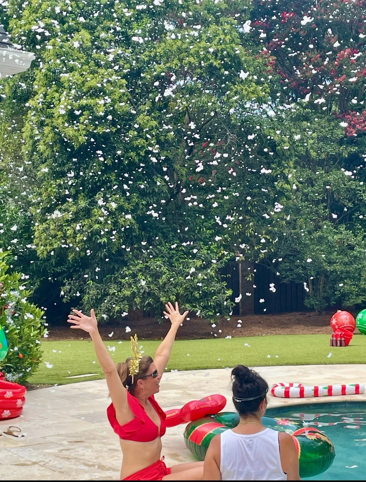Our Christmas in July party has become an annual tradition, and this year we decided to once again have our Christmas (Vacation) in July theme since everyone had so much fun getting into the spirit of it the year before (here is the link to last year’s festivities if you want to revisit and compare—while last year was impressive, we humbly say this year was even better!). We took all of our favorite details from the previous year, upped our costume game, and added a few more festive touches for our favorite Christmas in July so far.